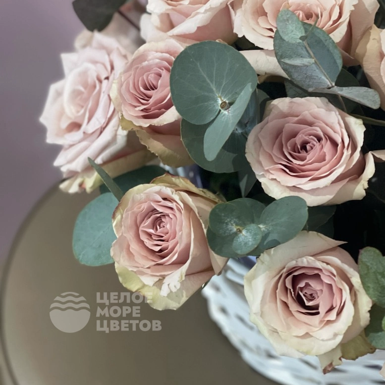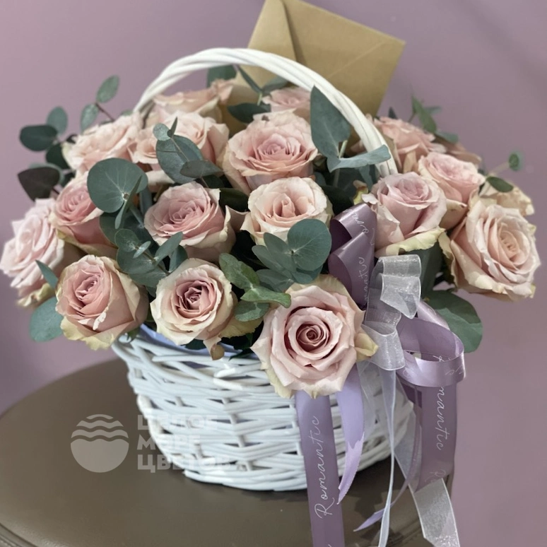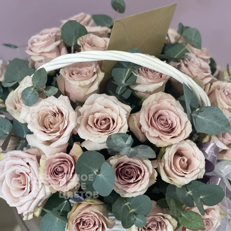 Этот изысканный букет представляет собой красивую корзину, наполненную 23 элегантными розами. В композицию добавлен нежный эвкалипт, который гармонично дополняет роскошные цветы. Букет идеально подходит для особых случаев, чтобы выразить любовь и уважение. Натуральные цветы в сочетании с свежими листьями создают ощущение уюта и свежести. Корзина аккуратно оформлена, что делает подарок особенно презентабельным. Такой букет станет прекрасным украшением любого интерьера или достойным подарком. Подарите радость и тепло с помощью этого изысканного цветочного композиций.