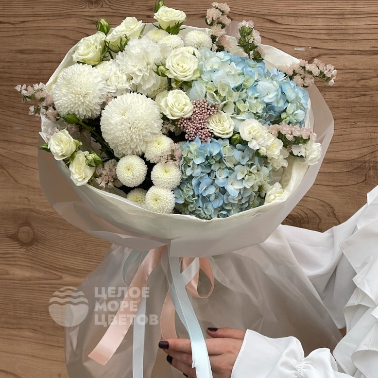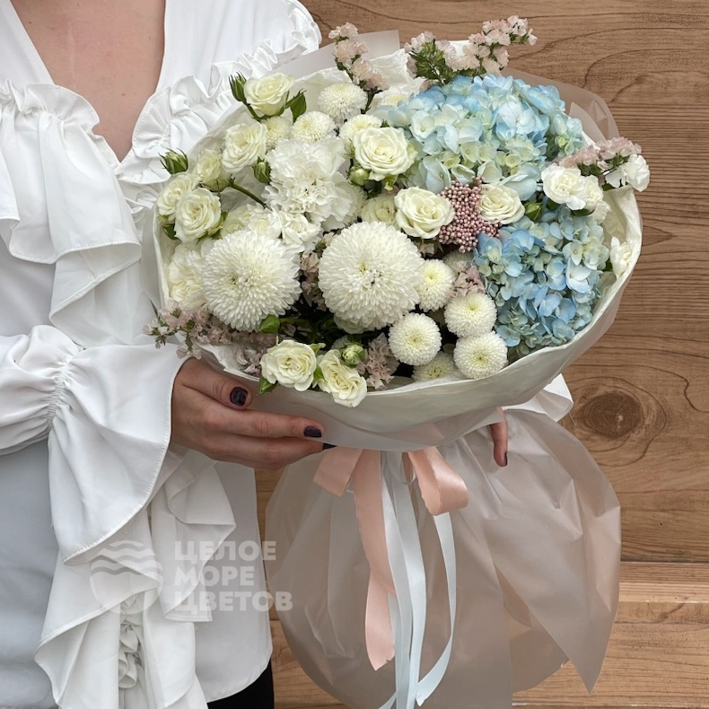 Букет «Голубая волна» — изысканное сочетание нежных цветов, создающее ощущение свежести и гармонии. В его составе эустома, хризантема, гвоздика, кустовая пионовидная роза и гортензия, каждый цветок добавляет своему уникальному оттенку. Этот букет идеально подойдет для тех, кто ценит элегантность и утонченность. Он станет прекрасным подарком для любого повода и подчеркнет особое настроение.