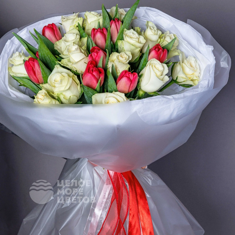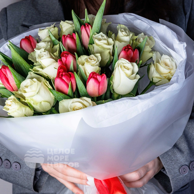 Букет «Нежный поцелуй» с тюльпанами и розами
