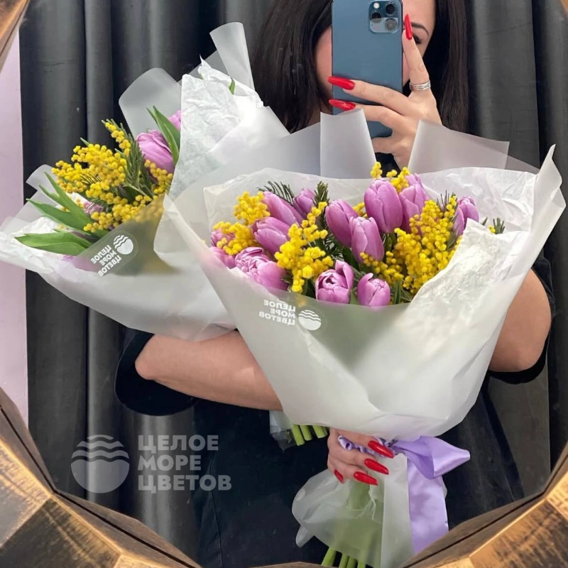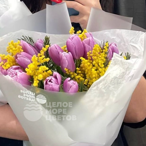 ГлавнаяКаталогБукетыВесенний букет тюльпаны с мимозой