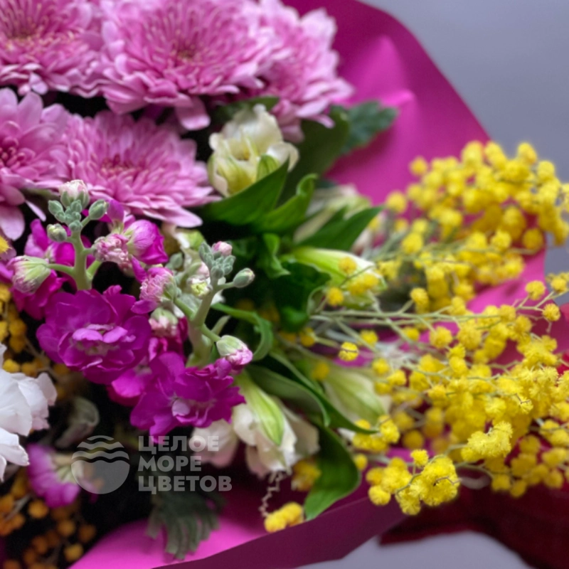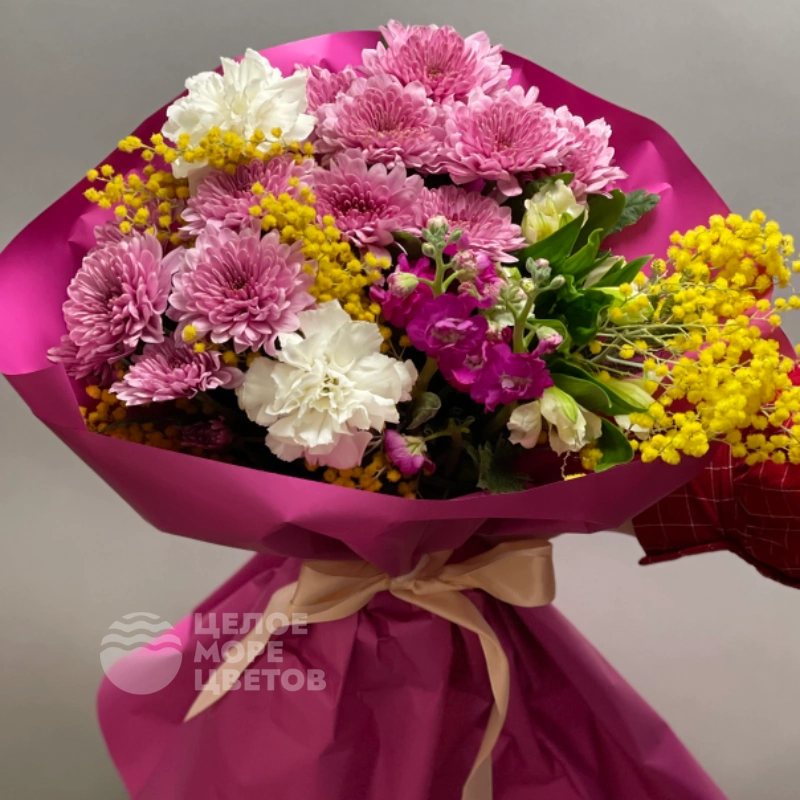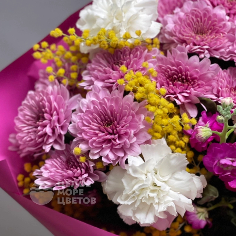 Букет Черемушка — изысканный букет, созданный для тех, кто ценит красоту и нежность. В его составе гармонично сочетаются яркая мимоза, изящные диантусы, пышные кустовые хризантемы и элегантные альстромерии. Этот цветочный ансамбль идеально подойдет для любого повода — будь то праздник, знак внимания или приятный сюрприз. Нежные оттенки и насыщенные цвета делают букет выразительным и запоминающимся. Он прекрасно подойдет для украшения интерьера и создания уютной атмосферы. Цветы красиво упакованы и аккуратно подготовлены для доставки. Букет Черемушка радует глаз и поднимает настроение своей свежестью и яркостью. Такой подарок обязательно порадует получателя и оставит приятные впечатления.