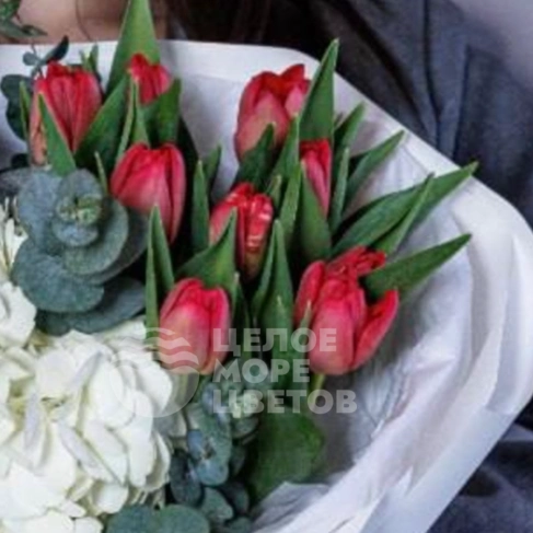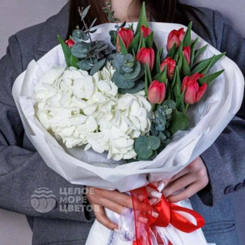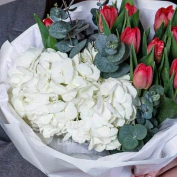 Букет из гортензий с тюльпанами «Сердечный аккорд»