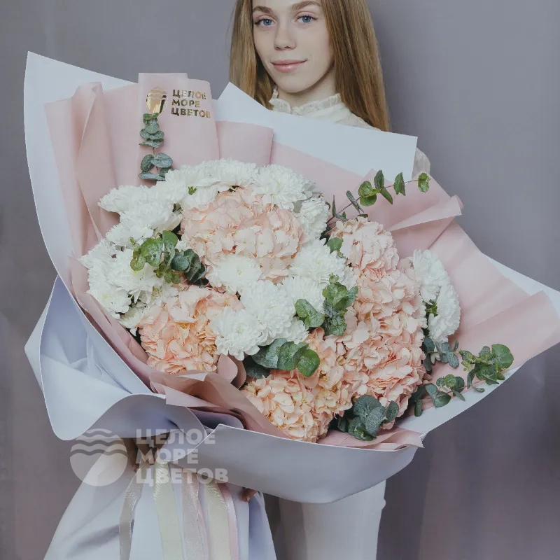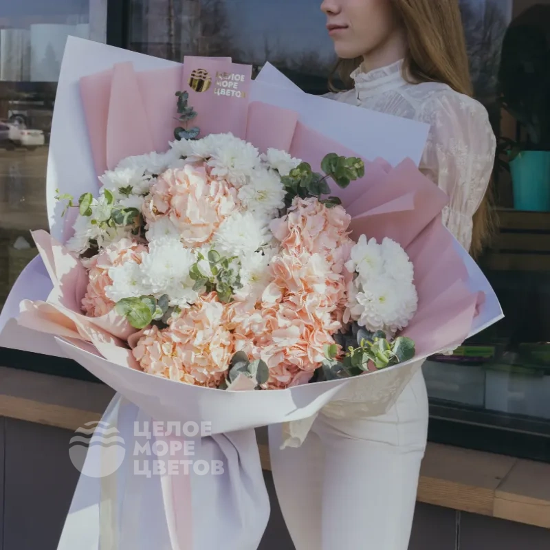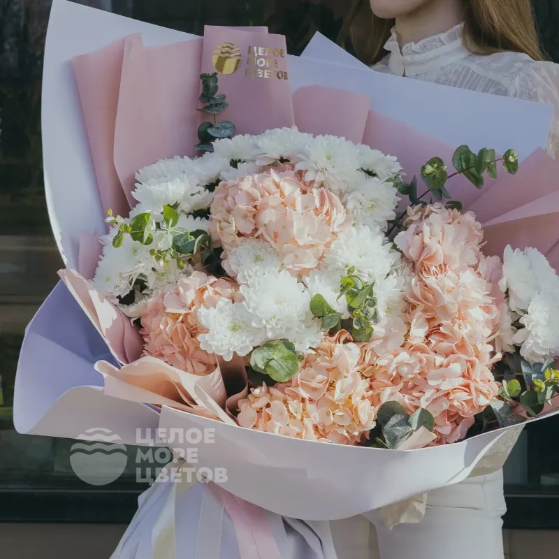 Нежный авторский объемный букет с розовыми гортензиями и кустовыми белоснежными хризантемами, упакованный в приятный белый фоамиран. Идеально подходит в качестве эффектного подарка на день рождения, любимой девушке на свидание или без повода. В подарок идет фирменный конверт с инструкцией по уходу и кризалом.
