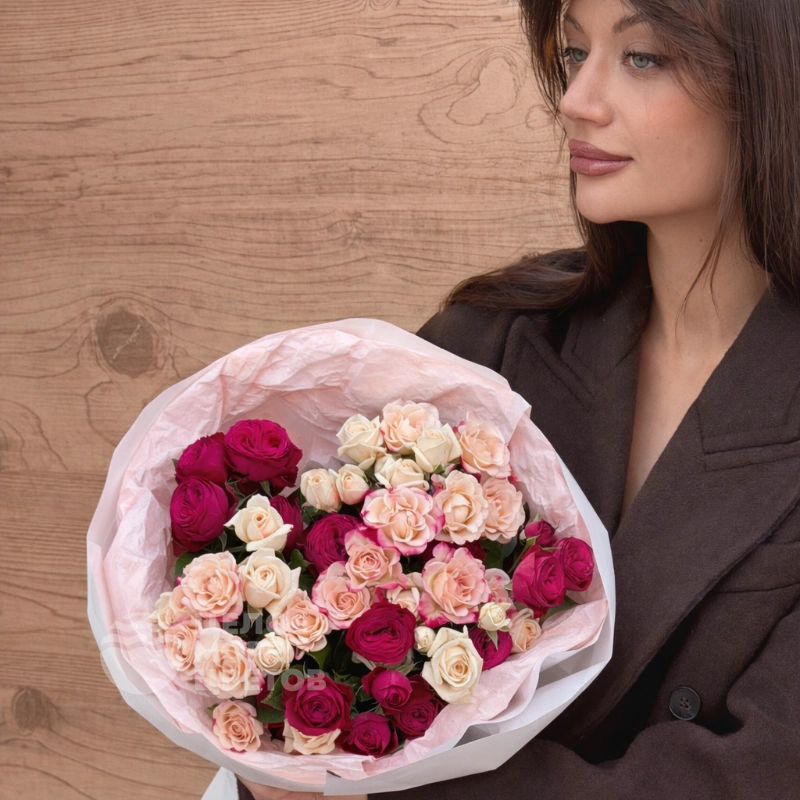 Этот букет символ нежности и страсти, воплощенный в изящном танце розовых, кремовых и глубоких бордовых роз. Он словно создан для того, чтобы пленить сердце и подарить незабываемые эмоции.
