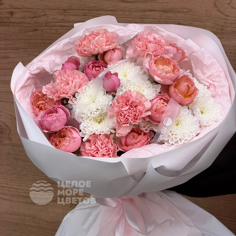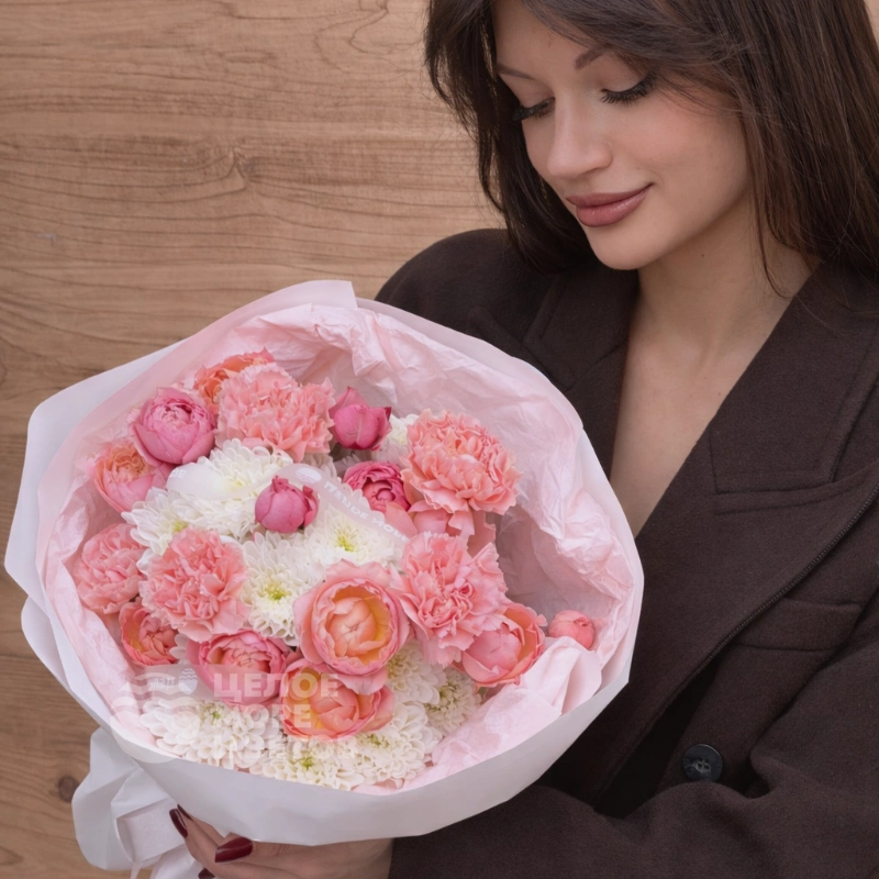 Нежный букет в пастельных тонах воплощение легкости и романтики. Мягкие оттенки розового и кремового создают атмосферу уюта и тепла, даря ощущение безмятежности. Идеальный выбор для выражения искренних чувств и создания особенного настроения.